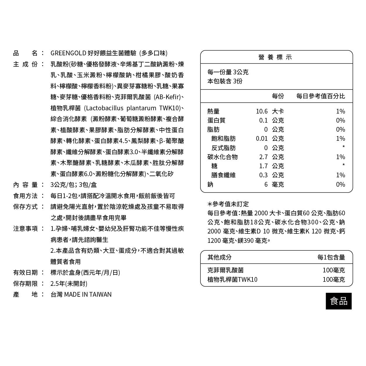 主成分 : 乳酸粉 (砂糖、優格發酵液、辛烯基丁二酸鈉澱粉、煉乳、乳酸、玉米澱粉、檸檬酸鈉、柑橘果膠、酸奶香料、檸檬酸、檸檬香料粉)、異麥芽寡糖粉、乳糖、果寡糖、麥芽糖、優格香料粉、克菲爾乳酸菌 (AB-Kefir)、植物乳桿菌 (Lactobacillus plantarum TWK10)、綜合消化酵素 (澱粉酵素、葡萄糖澱粉酵素、複合酵素、植酸酵素、果膠酵素、脂肪分解酵素、中性蛋白酵素、轉化酵素、蛋白酵素 4.5、鳳梨酵素、β-葡聚醣酵素、纖維分解酵素、蛋白酵素3.0、半纖維素分解酵素、木聚醣酵素、乳糖酵素、木瓜酵素、胜肽分解酵素、蛋白酵素 6.0、澱粉糖化分解酵素)、二氧化矽