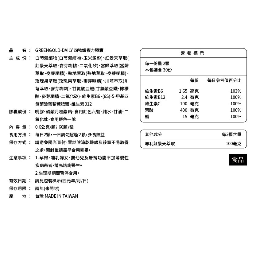 ・素食不可食用 ・生理期期間暫停食用 ・建議和咖啡、茶、鈣、鎂分開服用 ・地中海貧血不建議食用