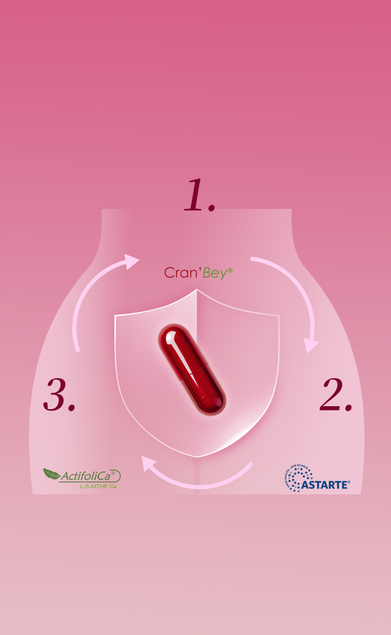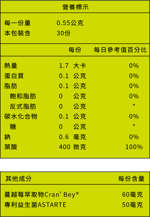 主成分:麥芽糊精、蔓越莓萃取物 Cran’Bey® (蔓越莓萃取物、米澱粉、麥芽糊精)、益生菌ASTARTE (麥芽糊精、乳酸菌(Lactobacillus crispatus、Lactobacillus gasseri、Lactobacillus jensenii、Lactobacillus rhamnosus))、L-5-甲基四氫葉酸鈣 ActifoliCa® 素食膠囊成分:羥丙基甲基纖維素、純水、鹿角菜膠、食用紅色四十號、氯化鉀、食用藍色一號