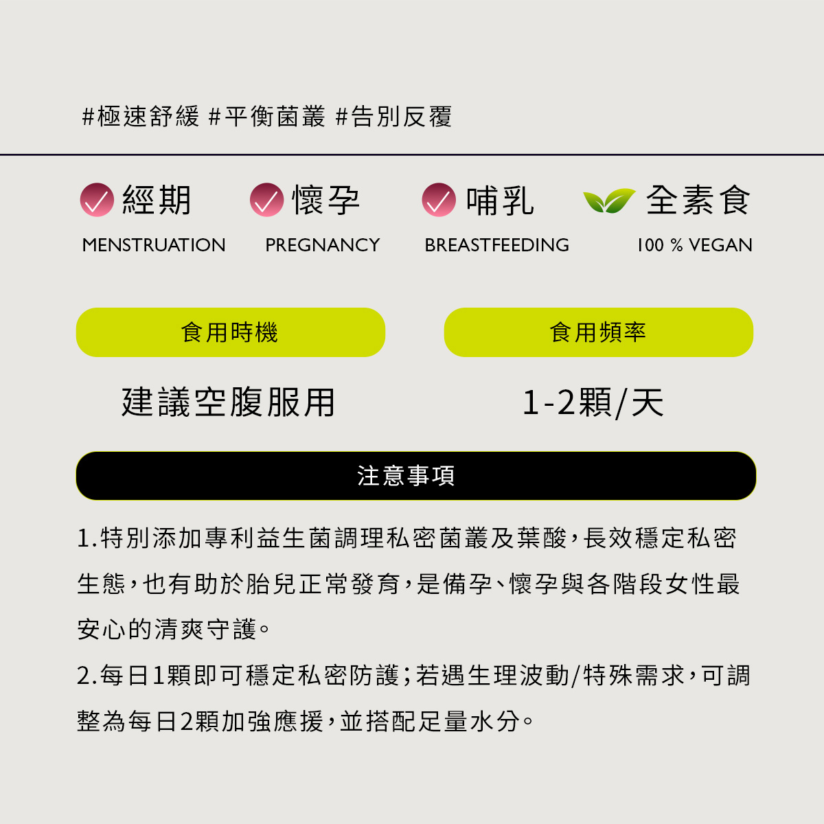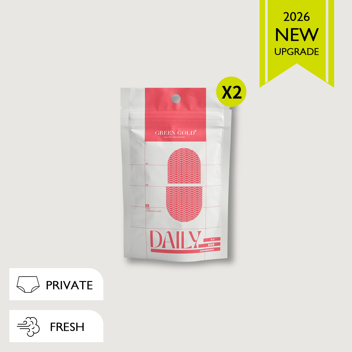 GREENGOLD蔓越莓複方膠囊II每日1顆即可穩定私密防護;若遇生理波動/特殊需求,可調整為每日2顆加強應援,並搭配足量水分。